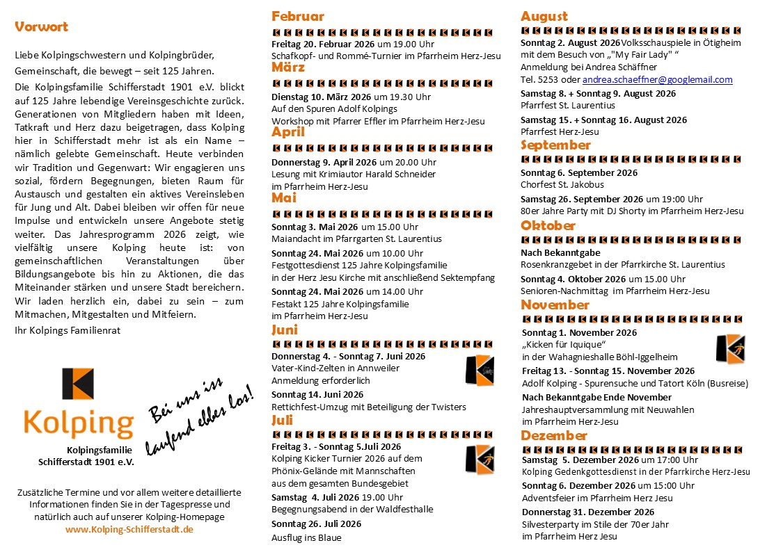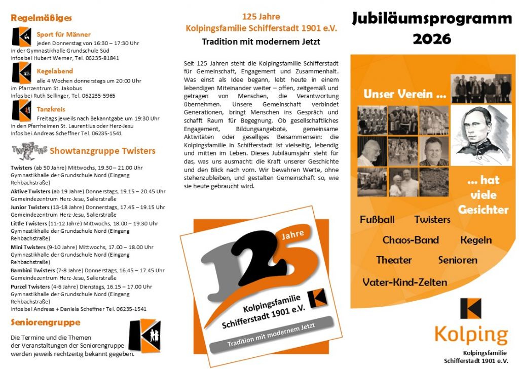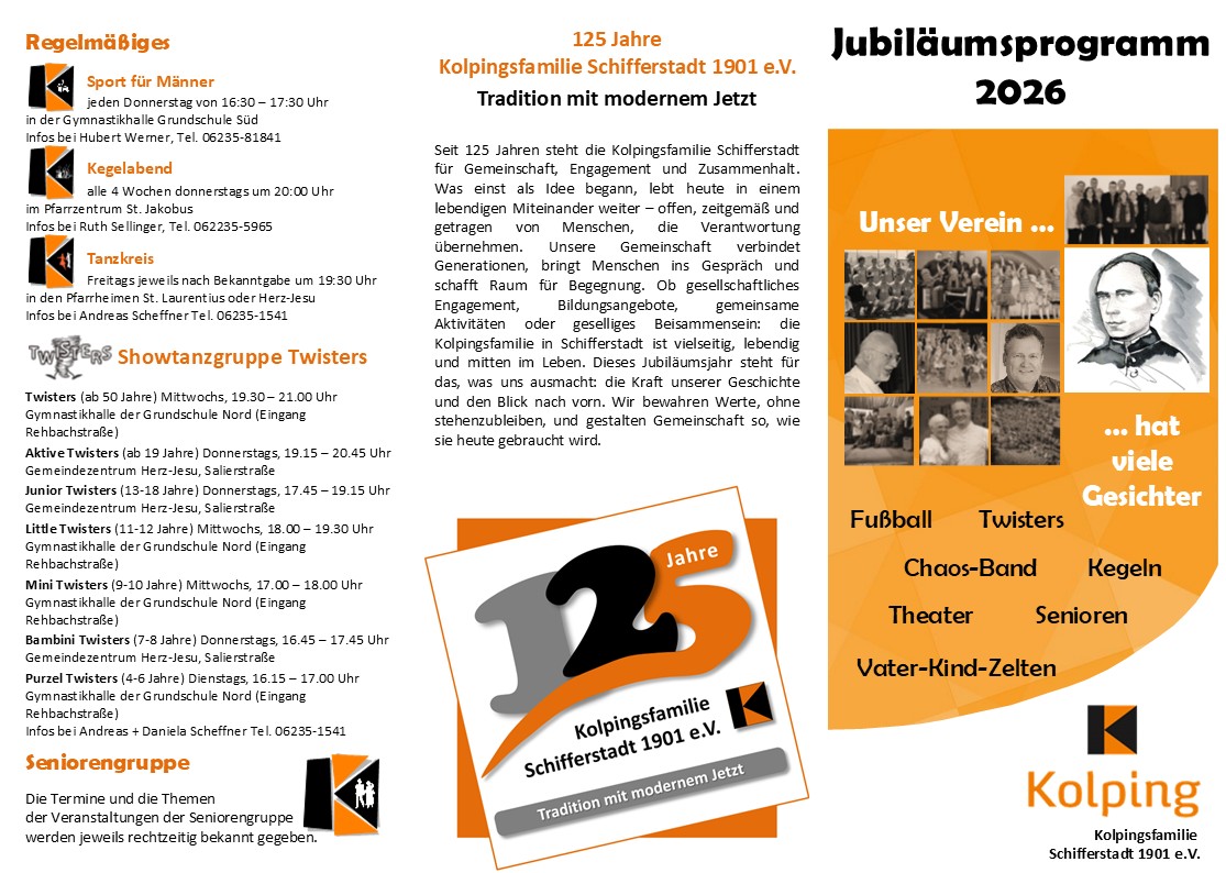 in diesem Jahr feiern wir das 125-jährige Jubiläum unserer Kolpingsfamilie in Schifferstadt und haben dementsprechend ein besonderes Veranstaltungsprogramm zusammengestellt.