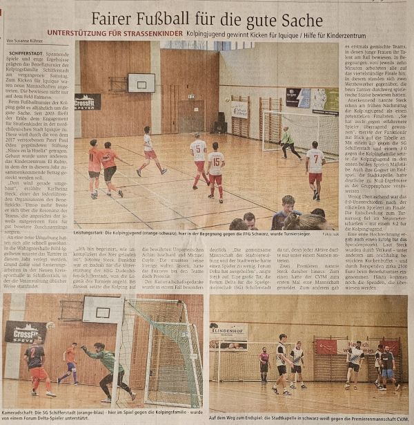 Die Fußballer der Kolpingsfamilie Schifferstadt laden zu ihrem traditionellen Benefiz- Fußballturnier „Kicken für Iquique“ in die Neue Kreissporthalle ein (ab 10:00 Uhr).