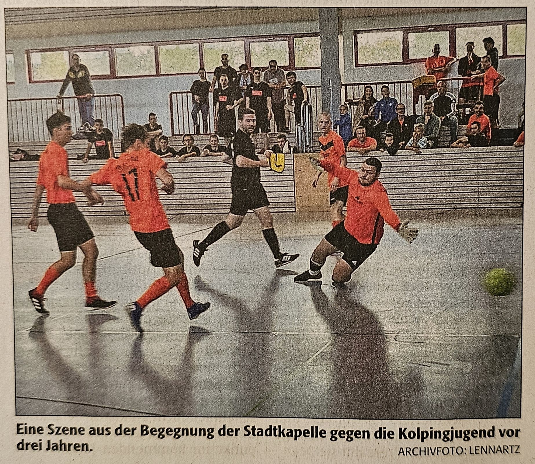 Die zahlreichen Zuschauer konnten sich über viele Tore freuen, insbesondere bei den Platzierungsspielen. Die rote Laterne ging in diesem Jahr an das junge Team der Meßdiener, denen der berühmte „Fußball-Gott“ nicht hold war. Im Spiel um Platz 7 bezwangen die Leichtathleten die Stadtkapelle mit 5:2. Platz 5 belegte die Spielgemeinschaft Stadtwerke/Feuerwehr/Stadtverwaltung nach einem 4:0 Sieg über die Jungs vom Forum Delta. Im kleinen Endspiel trafen die beiden Kolping-Teams aufeinander. Letztendlich siegten die Kolping-Herren gegen die Jungkolping mit 2:1 im 9m-Schießen. Verdienter Turniersieger mit 5:1 wurde 2024 die Familien-Fußball- Gemeinschaft (FFG) Schwarz im Duell mit den Handballern, die erneut unter Beweis stellten, dass sie nicht nur das „Spiel mit den Händen“ beherrschen.