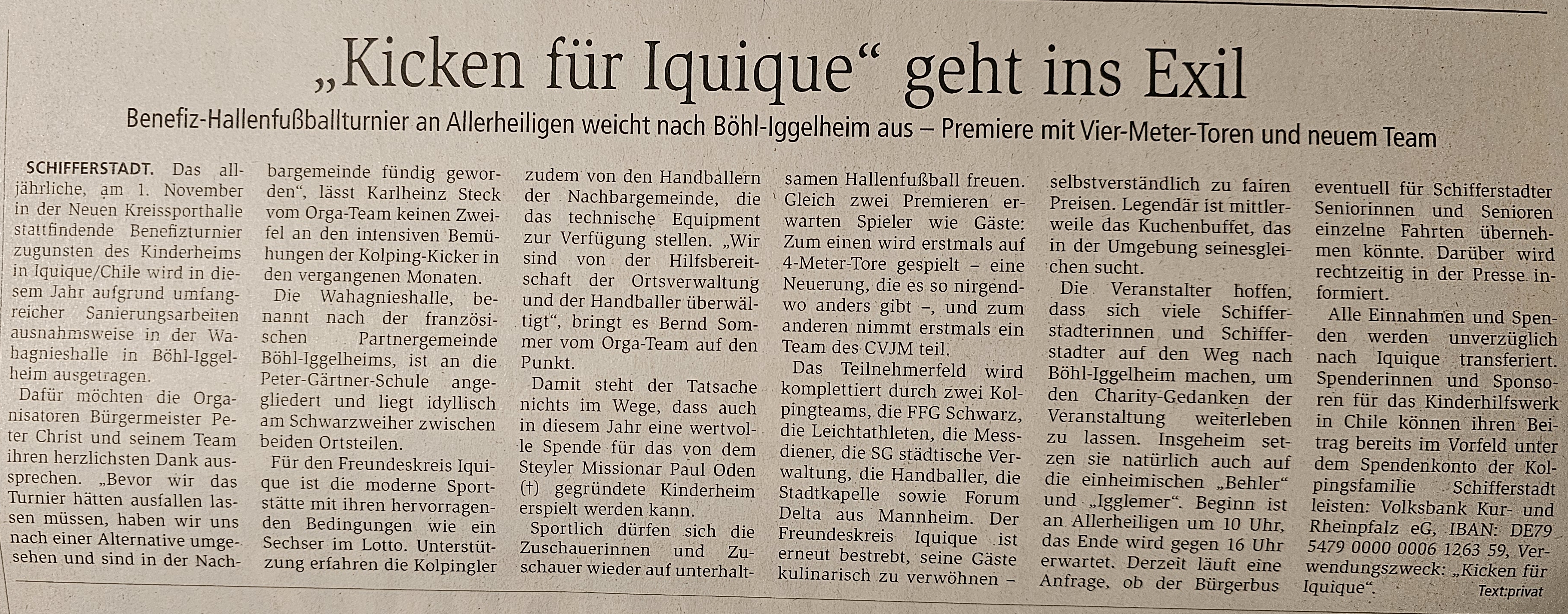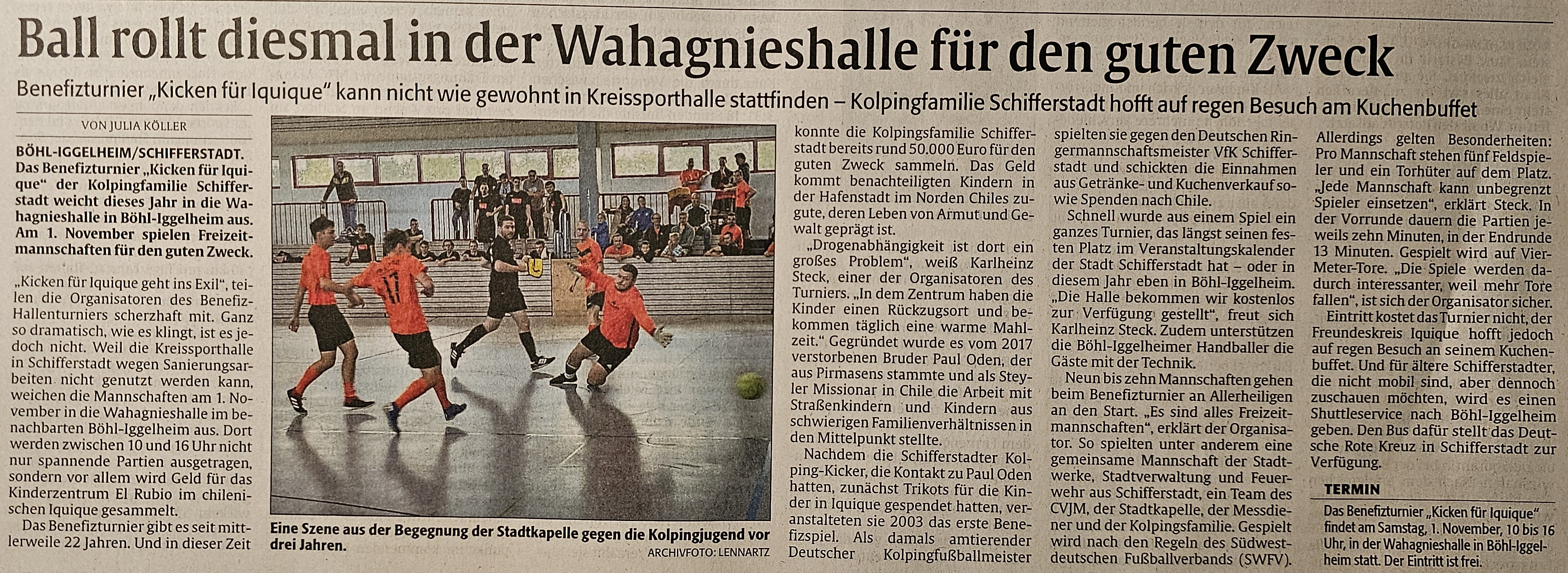 Das alljährliche, am 1. November in der Neuen Kreissporthalle stattfindende Benefizturnier zugunsten des Kinderheims in Iquique/Chile wird in diesem Jahr aufgrund umfangreicher Sanierungsarbeiten ausnahmsweise in der Wahagnieshalle in Böhl-Iggelheim ausgetragen.