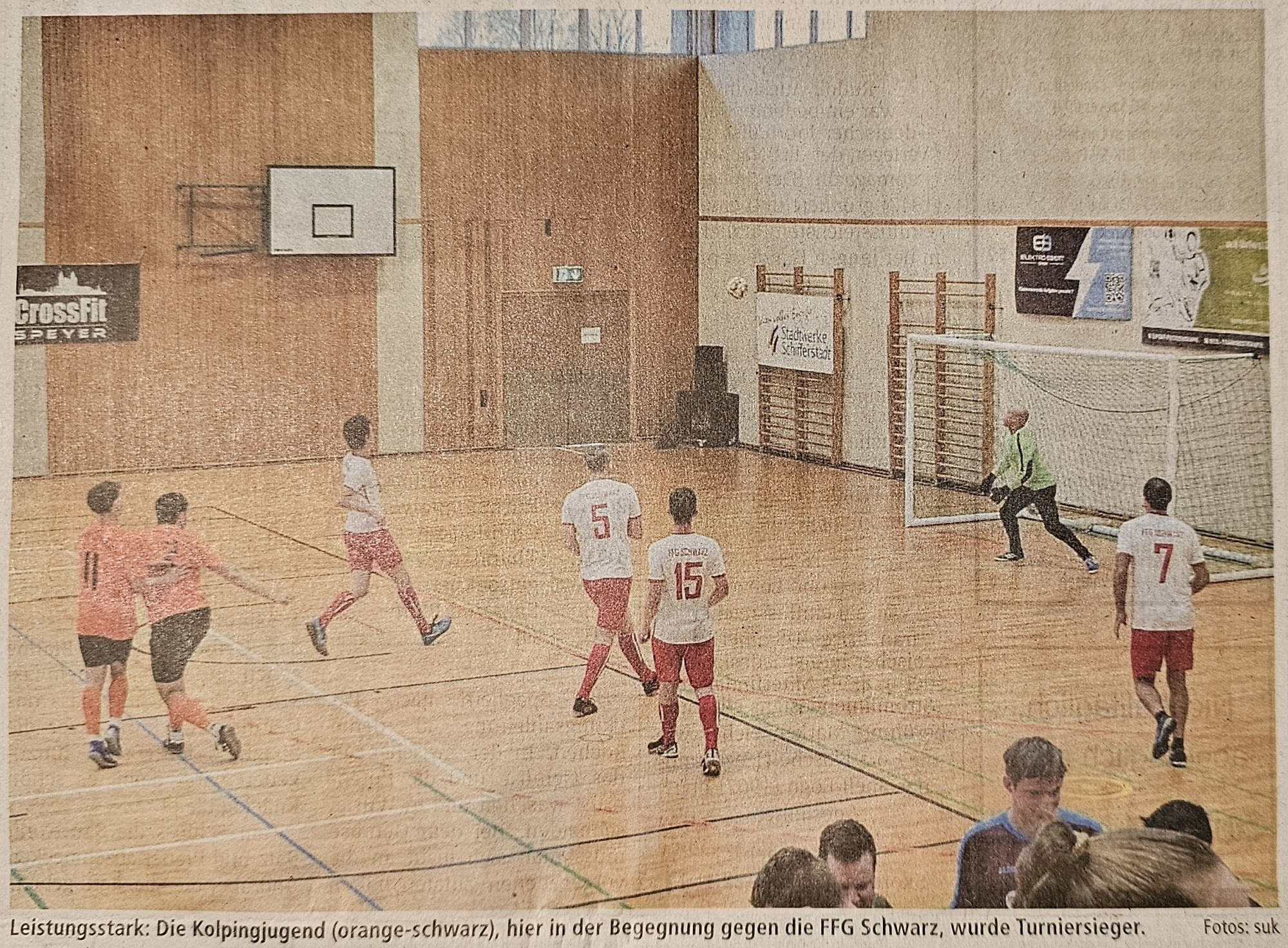 Zehn Mannschaften nahmen nun an der inoffiziellen Stadtmeisterschaíl teil und unterstützten damit die Benefizaktion der Kolpingsfamilie Schifferstadt. „Mannschaften wie die der Freiwilligen Feuerwehr oder der Stadtwerke sind natürlich eine echte Bereichenıng für diese Veranstaltung", erklärte Mitorganisator Karl Teutsclı mit Blick auf die Neulinge im Turniertableau, die von zahlreichen Fans auf den Rängen unterstützt wurden. Und die Stadtwerke schafften auf Anhieb den Sprung ins Finale, trafen dort auf den Skiclub, der 2017 mit einem beachtlichen dritten Rang eine gelungene Premiere gefeiert hatte. Das Finale war denn auch ein Spiegelbild der kompletten Turnierveranstaltung. Packende Szenıen, viele Tore und eine hauchdünne Entscheidung. Die Stadtwerke führten dreimal, der Skiclub glich dreimal aus - zuletzt mit der Schlusssirene. Ein Neunmeterschießen musste die Enlscheidımg bringen und hier erwiesen sich die Wintersporller als die treffsichereren. Im kleinen Finale gewannen die Leichtathleten hauchdünn gegen die Handballer.