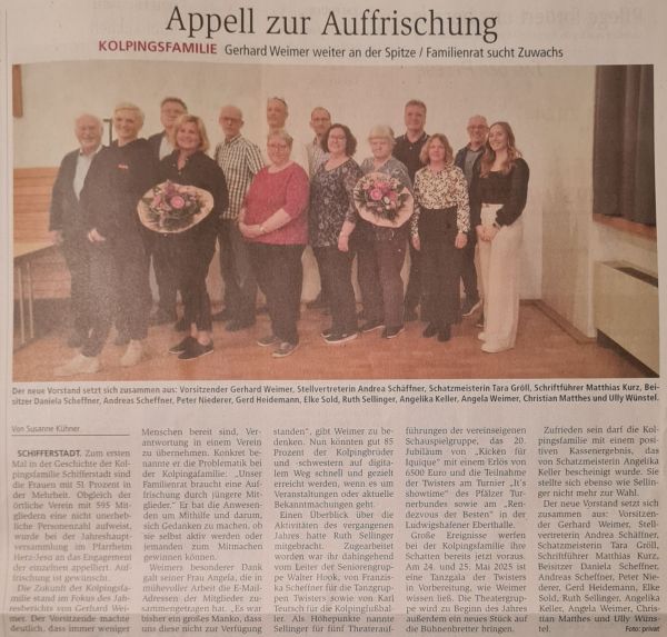 Große Ereignisse werfen bei der Kolpingsfamilie ihre Schatten bereits jetzt voraus. Am 24. und 25. Mai 2025 ist eine Tanzgala der Twisters in Vorbereitung, wie Weimer wissen ließ. Die Theatergruppe wird zu Beginn des Jahres außerdem ein neues Stück auf die Bühnenbretter bringen. Zufrieden sein darf die Kolpingsfamilie mit einem positiven Kassenergebnis, das von Schatzmeisterin Angelika Keller bescheinigt wurde. Sie stellte sich ebenso wie Sellinger nicht mehr zur Wahl. Der neue Vorstand setzt sich zusammen aus: Vorsitzender Gerhard Weimer, Stellvertreterin Andrea Schäffner, Schatzmeisterin Tara Gröll, Schriftführer Matthias Kurz, Beisitzer Daniela Scheffner, Andreas Scheffner, Peter Niederer, Gerd Heidemann, Elke Sold, Ruth Sellinger, Angelika Keller, Angela Weimer, Christian Matthes und Ully Wünstel.
