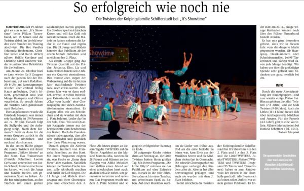 Somit erreichten die Twisters der Kolpingsfamilie Schifferstadt bei It‘s Showtime 4 x den 2. Platz und 1x den 3. Platz und die LittleTWISTERS, JuniorTWISTER5, AktivenTWISTER5 und TWISTERS insgesamt 95 Tänzer und Tänzerinnen haben es zum Rendezvous der Besten in die Ebert halle geschafft. Alle freuen sich auf einen tollen Auftritt vor einem großen Publikum. Es findet statt am 23.11., einige wenige Restkarten können noch über den Pfälzer Turnerbund bestellt werden.