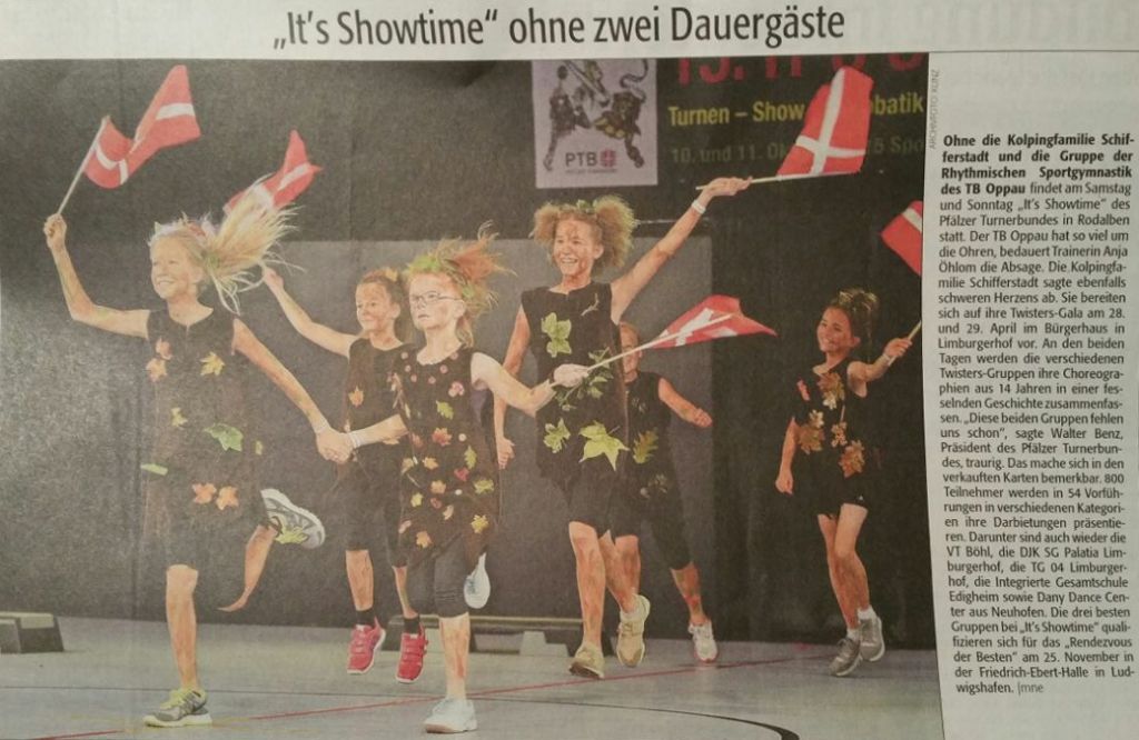 Die Twister der Kolpingsfamilie Schifferstadt in diesmal nicht bei dem Showtanz Event "It's Showtime" des Pfälzer Turnerbundes in Rodalben vertreten. Aufgrund der im April 2018 geplanten eigenen Tanzgala "Gala der Träume" können die Schifferstadter Tänzer den notwendigen zusätzlichen Trainingsaufwand nicht stemmen und verzichten deshalb auf Ihre Teilnahme. Beim nächsten mal sind sie aber sicher wieder mit dabei.