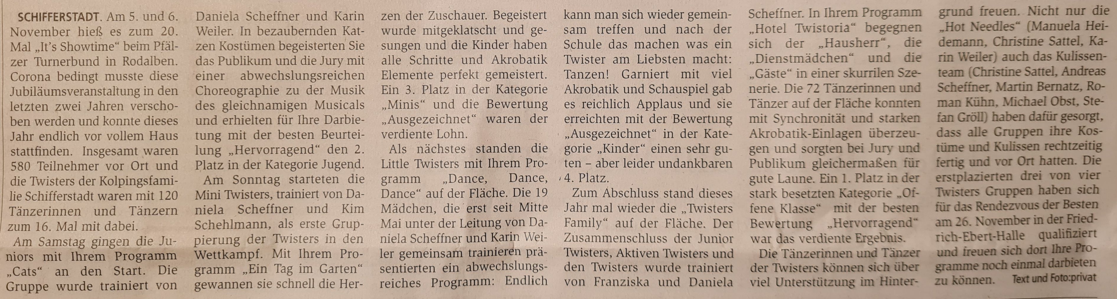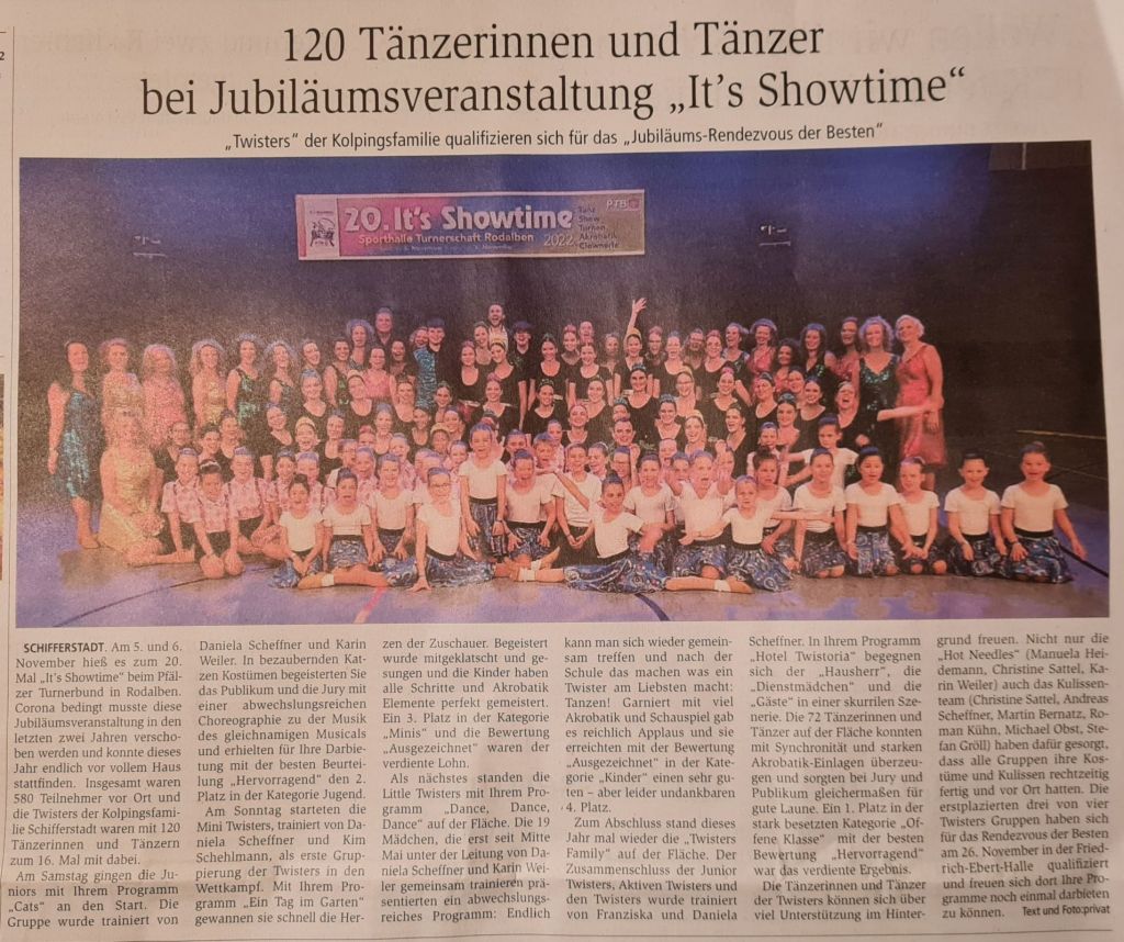 Am 5. und 6. November hieß es zum 20. Mal „It’s Showtime“ beim Pfälzer Turnerbund in Rodalben. Corona bedingt musste diese Jubiläumsveranstaltung in den letzten zwei Jahren verschoben werden und konnte dieses Jahr endlich vor vollem Haus stattfinden. Insgesamt waren 580 Teilnehmer vor Ort und die Twisters der Kolpingsfamilie Schifferstadt waren mit 120 Tänzerinnen und Tänzern zum 16. Mal mit dabei.