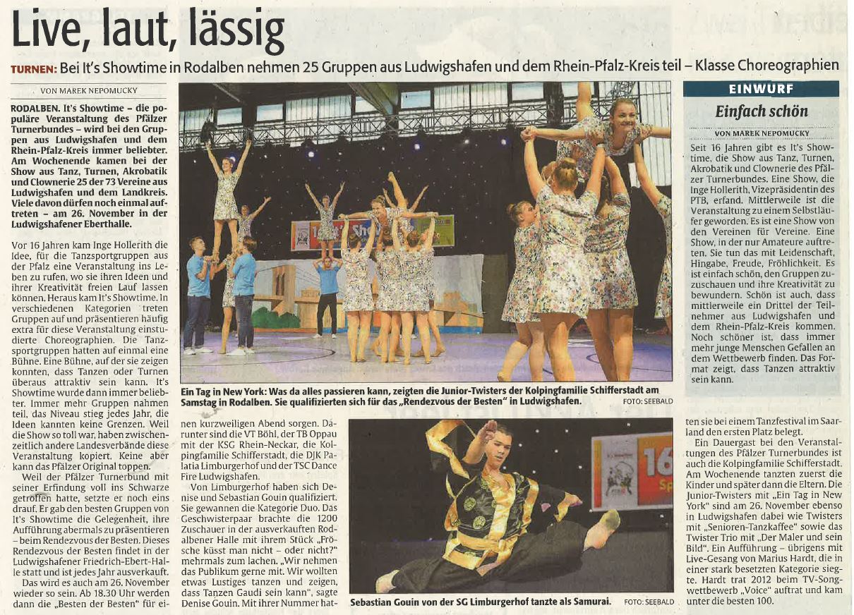 Seit 16 Jahren gibt es lt's Showtime, die Show aus Tanz, Turnen, Akrobatik und Clownerie des Pfälzer Turnerbundes. Eine Show, die Inge Hollerith, Vizepräsidentin des PTB. erfand. Mittlerweile ist die Veranstaltung zu einem Selbstläufer geworden. Es ist eine Show von den Vereinen für Vereine. Eine Show, in der nur Amateure auftreten. Sie tun das mit Leidenschaft, Hingabe, Freude, Fröhlichkeit. Es ist einfach schön, den Gruppen zuzuschauen und ihre Kreativität zu bewundern. Schön ist auch, dass mittlerweile ein Drittel der Teilnehmer aus Ludwigshafen und dem Rhein-Pfalz-Kreis kommen. Noch schöner ist, dass immer mehr junge Menschen Gefallen an dem Wettbewerb finden. Das Format zeigt, dass Tanzen attraktiv sein kann.