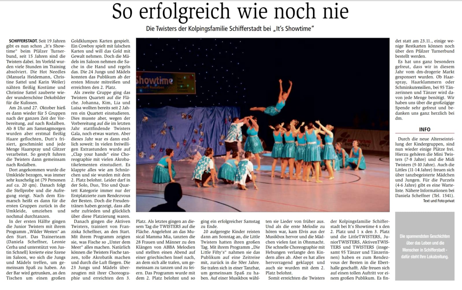 Nach dem sie im letzten Jahr aufgrund der Vorbereitung Ihrer eigenen "Gala der Träume" nicht bei dem Showtanz Event "It's Showtime" des Pfälzer Turnerbundes in Rodalben mit von der Partie waren, sind die Twisters der Kolpingsfamilie Schifferstadt in diesem Jahr wieder mit dabei und mit 4 verschiedenen Tanzgruppen (Kinder, Jugend, Aktive und B-Klasse) vertreten .