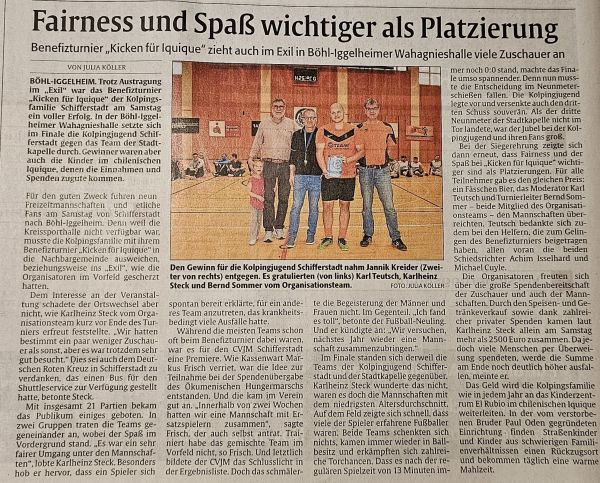 Zum wiederholten Male veranstaltet die Kolpingfamilie das beliebte Benefiz-Fußballturnier zugunsten von Straßenkinder in Iquique/Chile.