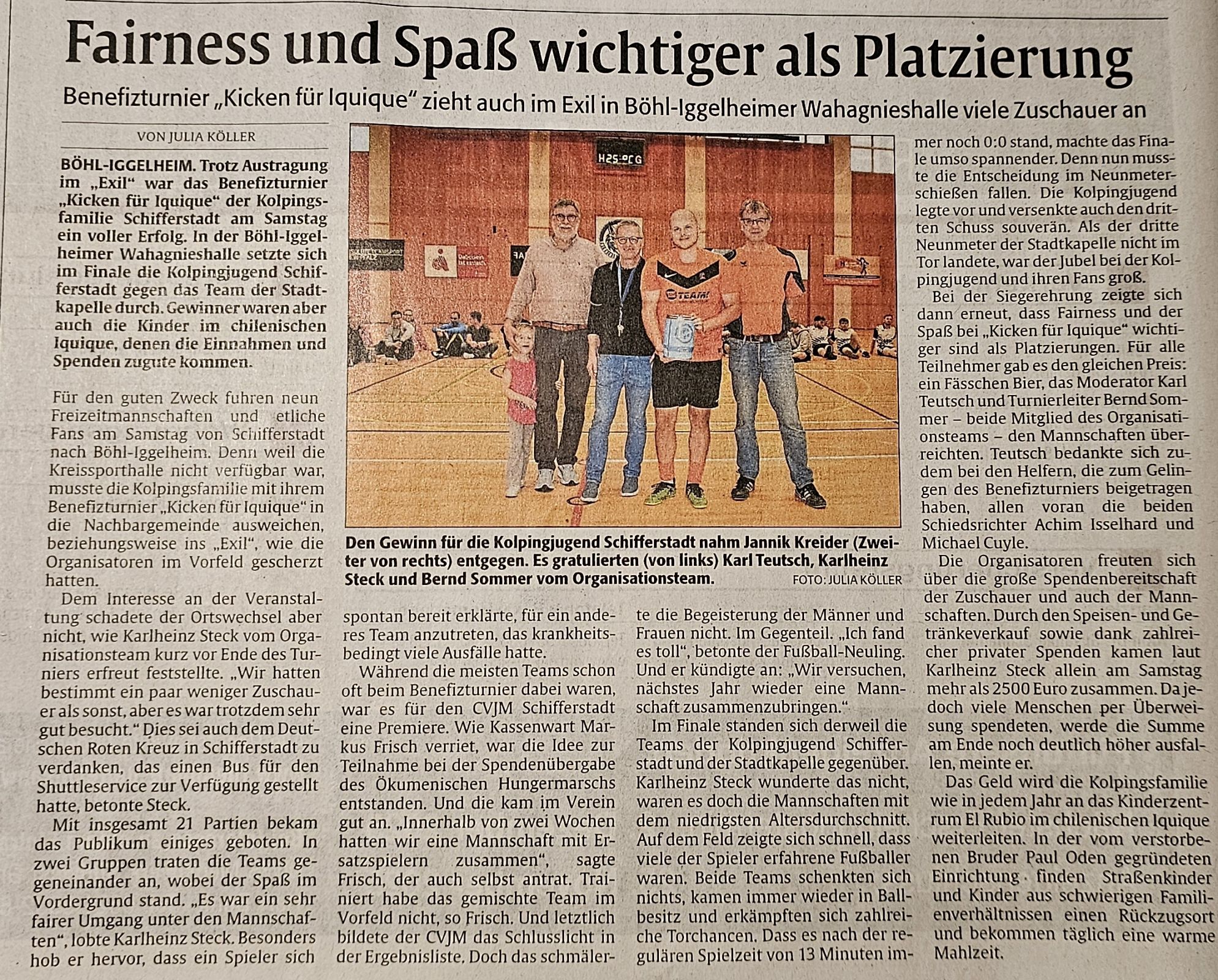 Trotz Austragung im „Exil" war das Benefizturnier „Kicken für Iquique" der Kolpingsfamilie Schifferstadt am Samstag ein voller Erfolg. In der Böhl-Iggelheimer Wahagnieshalle setzte sich im Finale die Kolpingjugend Schifferstadt gegen das Team der Stadtkapelle durch. Gewinner waren aber auch die Kinder im chilenischen Iquique, denen die Einnahmen und Spenden zugutekommen.