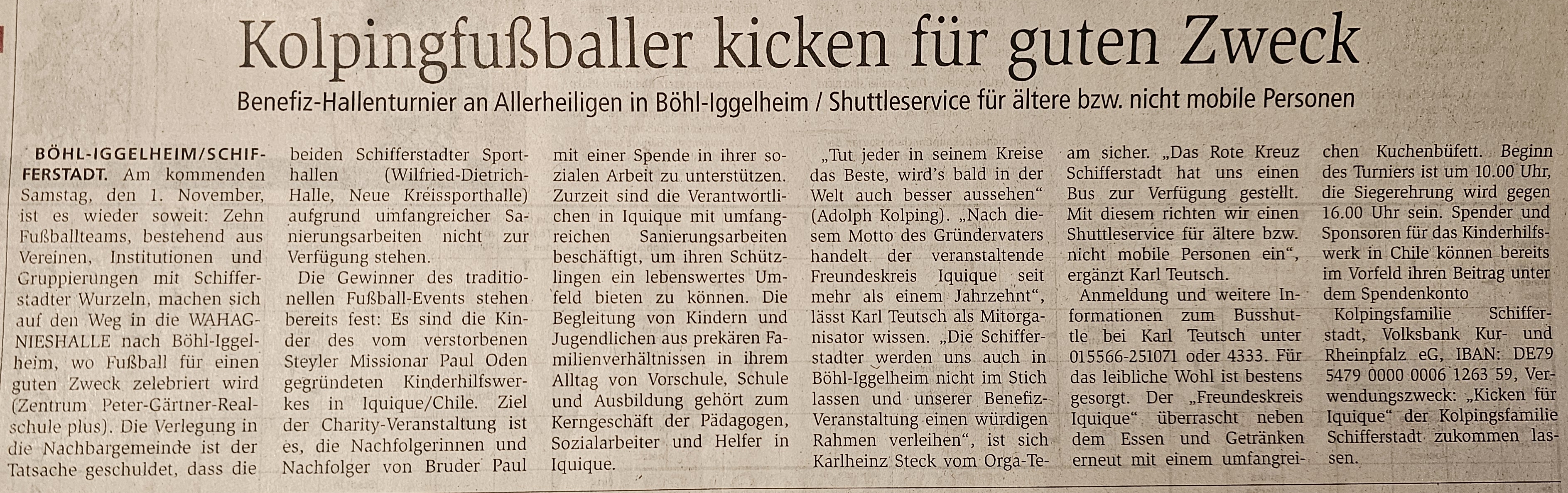 Benefizaktion „Kicken für Iquique" der Kolpingfamme Schifferstadt am 1 . November in der Neuen Kreissporthalle