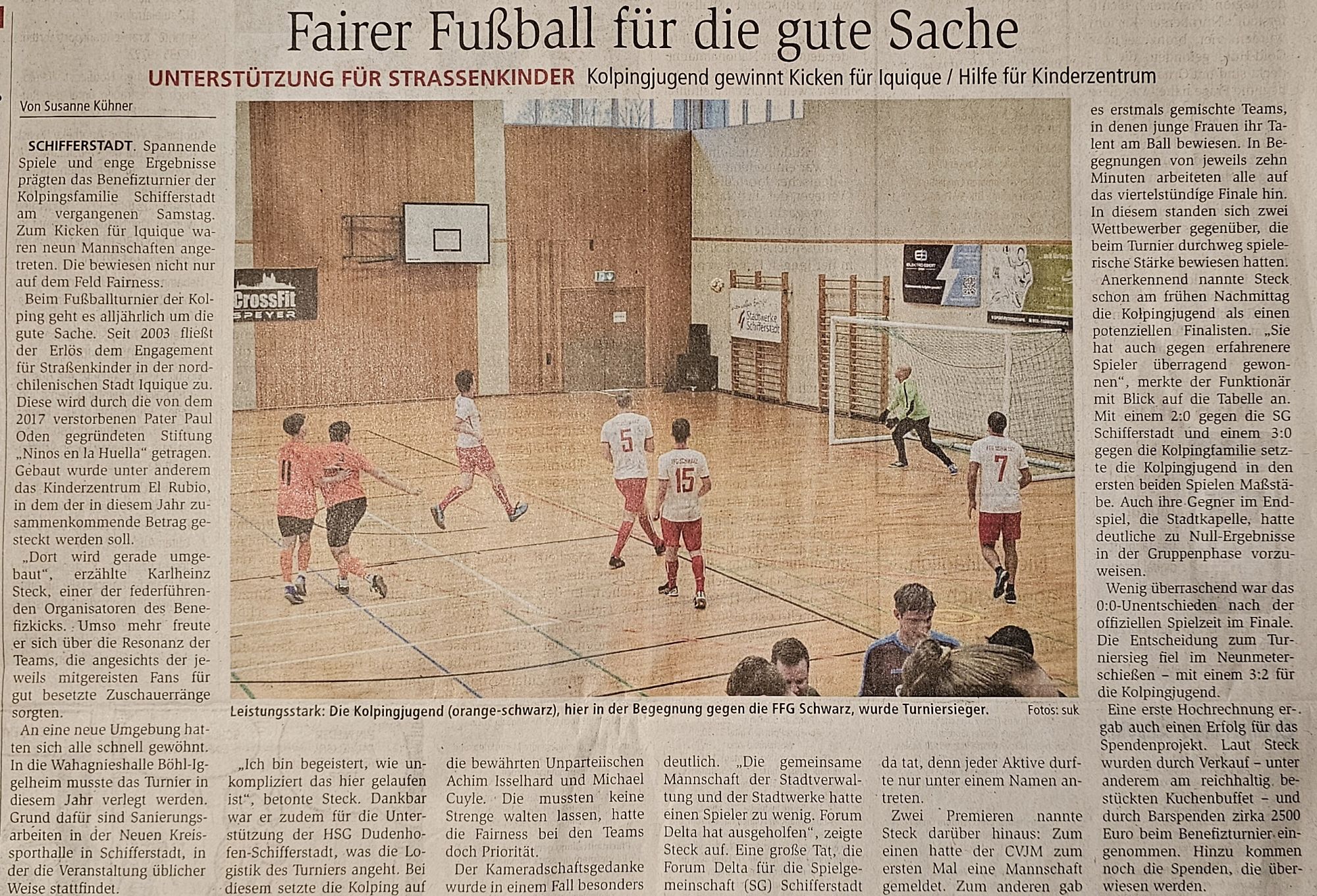 Die Fußballer der Kolpingsfamilie Schifferstadt laden zu ihrem traditionellen Benefiz- Fußballturnier „Kicken für Iquique“ in die Neue Kreissporthalle ein (ab 10:00 Uhr).