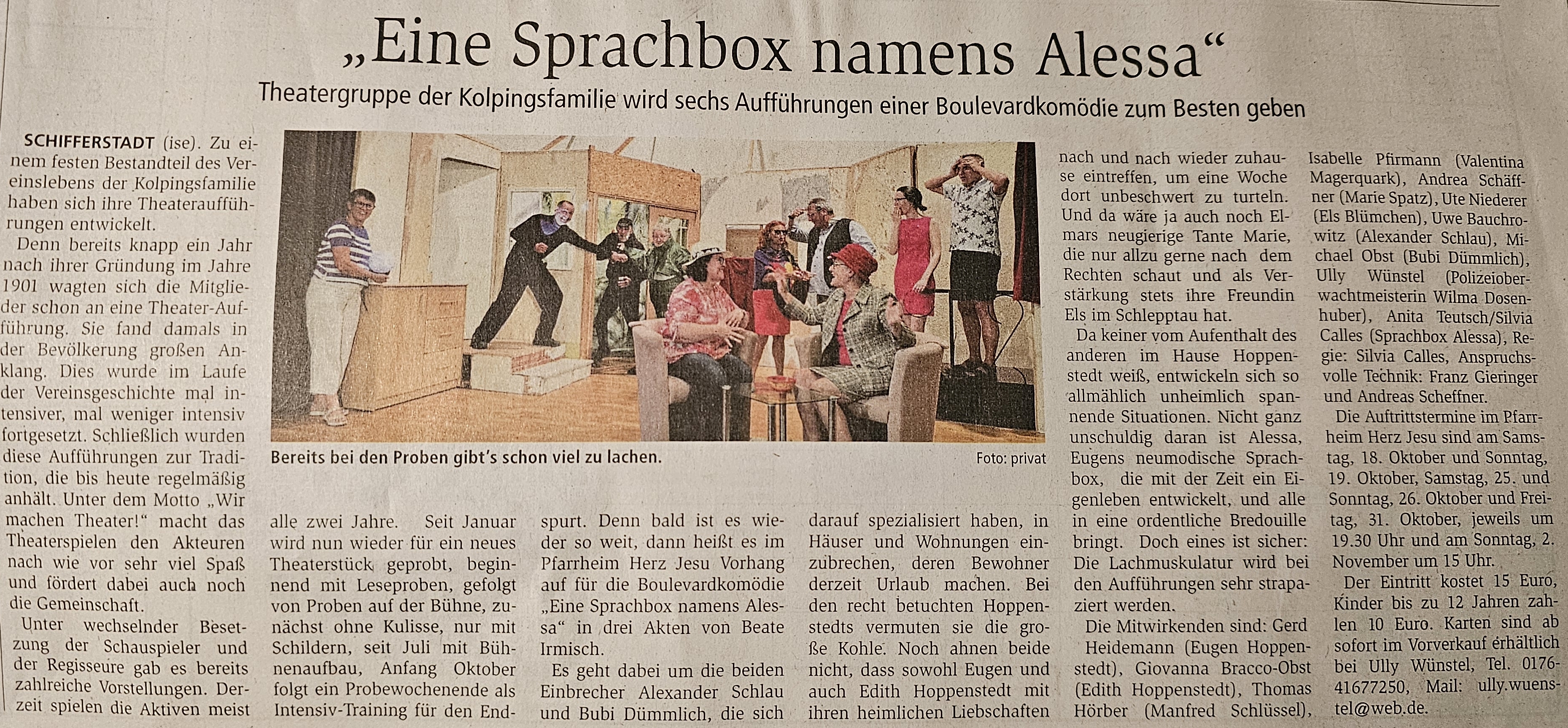 "Eine Sprachbox Namens Alessa" - Kolping Theatergruppe wird 6 Aufführungen einer Boulevard Komödie zum Besten geben