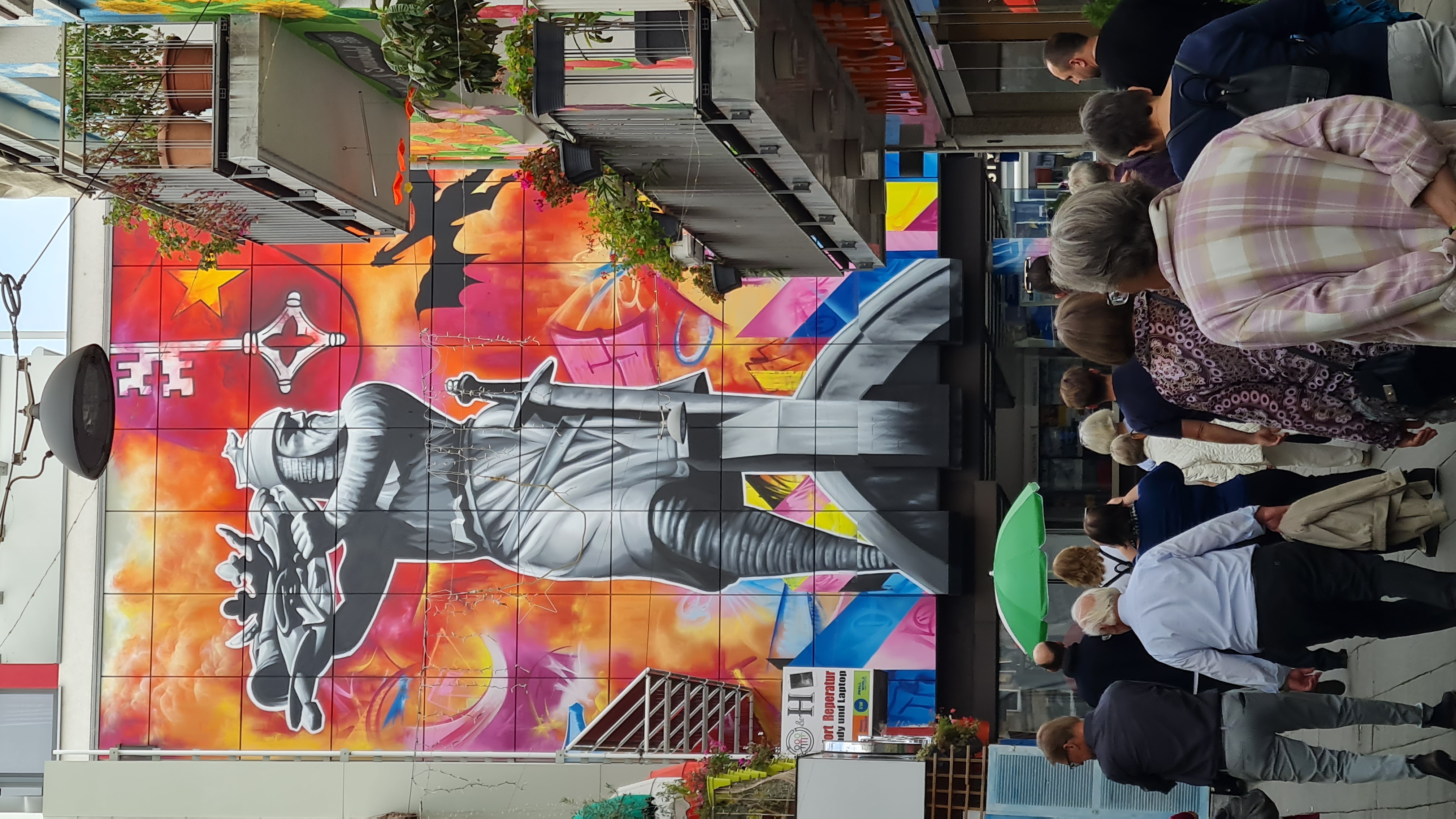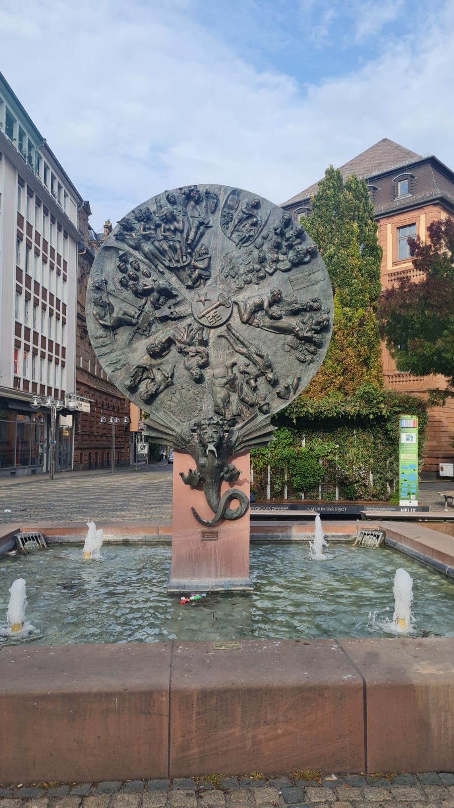 Weiter ging dann Weg vorbei am Siegfried-Brunnen in die Dreifaltigkeitskirche. Von dort durch die Fußgängerzone mit dem Blick auf ein das neue Graffiti als Denkmal für Hagen von Tronje vorbei am Schicksalsrad zum großen Lutherdenkmal. Das Schicksalsrat ist ein doppelseitiges, rotierendes Bronzerad, das 1986 von dem Bildhauer Gustav Nonnenmacher gestaltet wurde. Auf der einen Seite werden in Reliefszenen die bedeutenden historischen Ereignisse der Stadt gezeigt und auf der anderen Seite sind Sitten, Bräuche und Szenen aus dem Alltagsleben der Bevölkerung zu sehen.