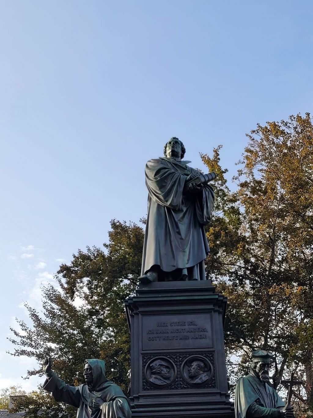 Der Abschluss der Tour war dann nach der Besichtigung des Lutherdenkmals auf dem Lutherplatz. Das Denkmal wurde von Ernst Rietschel geschaffen und 1868 enthüllt. Neben Ernst Rietschel, von dem die Gesamtkonzeption stammte, waren noch mehrere Künstler an der Ausführung beteiligt. Das Denkmal zeigt neben Luther -in der zentralen Position- zahlreiche Persönlichkeiten der Reichspolitik und des Humanismus, Mitstreiter der Kirchenreformation sowie drei Allegorien, die Ereignisse und Auswirkungen der Reformation symbolisieren.