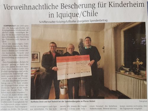 Seit 2003 spenden die Kolpingfußballer der Kolpingfamilie Schifferstadt alljährlich einen vierstelligen Betrag für das Kinderhilfswerk des verstorbenen Bruders Paul Oden aus Pirmasens nach Iquique in Chile.