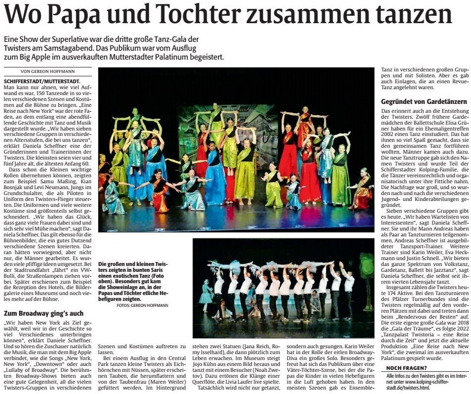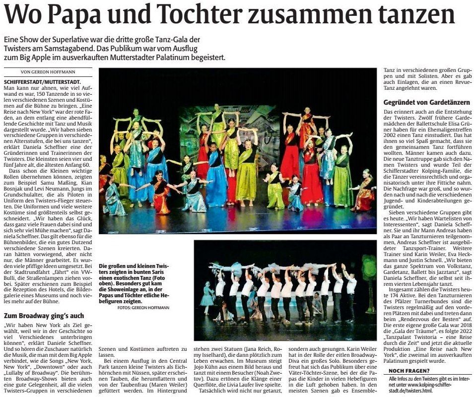 Insgesamt zählen die Twisters heute 174 Aktive. Bei den Tanzturnieren des Pfälzer Turnerbundes sind die Twisters regelmäßig auf den vorderen Plätzen mit dabei und treten dann beim „Rendezvous der Besten“ auf. Die erste eigene große Gala war 2018 die „Gala der Träume“, es folgte 2022 „Tanzpalast Twistoria – eine Reise durch die Zeit“ und jetzt die aktuelle Produktion „Eine Reise nach New York“, die zweimal im ausverkauften Palatinum gespielt wurde.